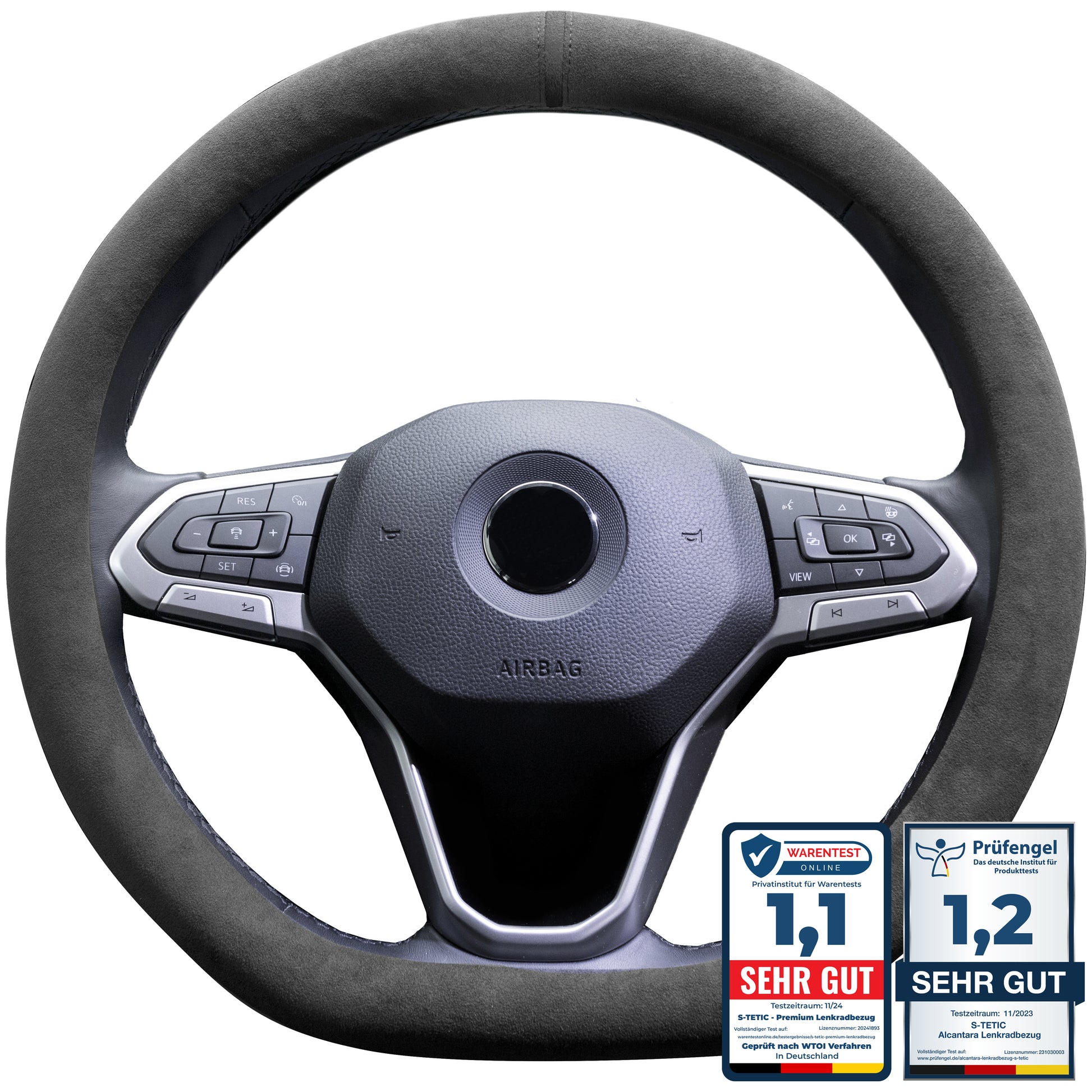 Unsere Alcantara-Lenkradbezüge wurden von renommierten Instituten für Produkttests, darunter dem Institut für Warentest und Prüfengel, getestet und mit den Bestnoten 1,1 und 1,2 („Sehr gut“) ausgezeichnet.